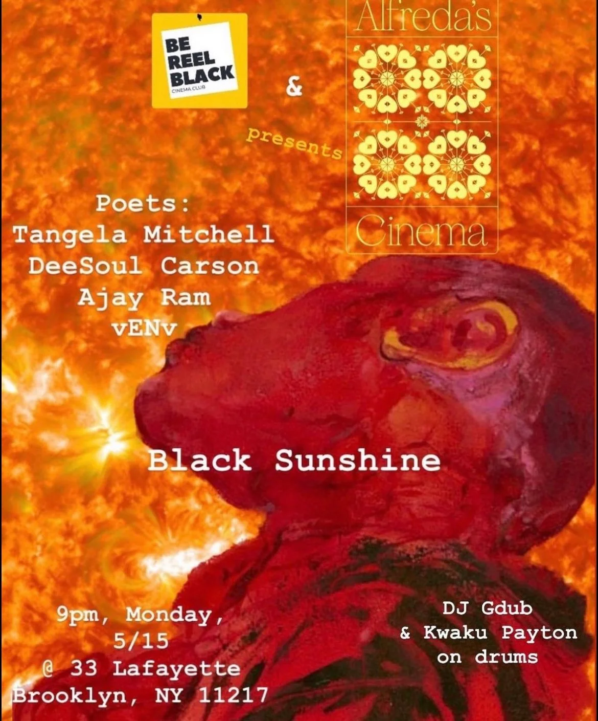 Back to All Events Be Reel Black Cinema Club and Alfreda's Cinema Present "Black Sunshine" Monday, May 15, 2023 9:00 PM 11:00 PM Google Calendar ICS Following a screening of the film Love Jones at Brooklyn Academy of Music (BAM), a poetry reading presented by Be Reel Black Cinema Club and Alfreda’s Cinema featuring poets Tangie Mitchell, DeeSoul Carson, Ajay Ram, and vENv.